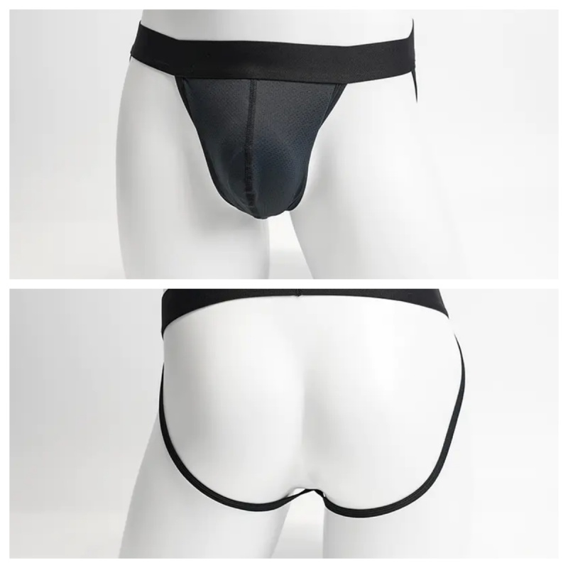 এগুলিতে একটি প্রশস্ত ইলাস্টিক কোমরবন্ধ, একটি সহায়ক থলি (প্রায়শই একটি প্রভাব-প্রতিরোধী কাপ সহ) এবং কোমরবন্ধের সাথে সংযোগ স্থাপনের জন্য পোঁদগুলির চারপাশে মোড়ানো দুটি স্ট্র্যাপ রয়েছে।